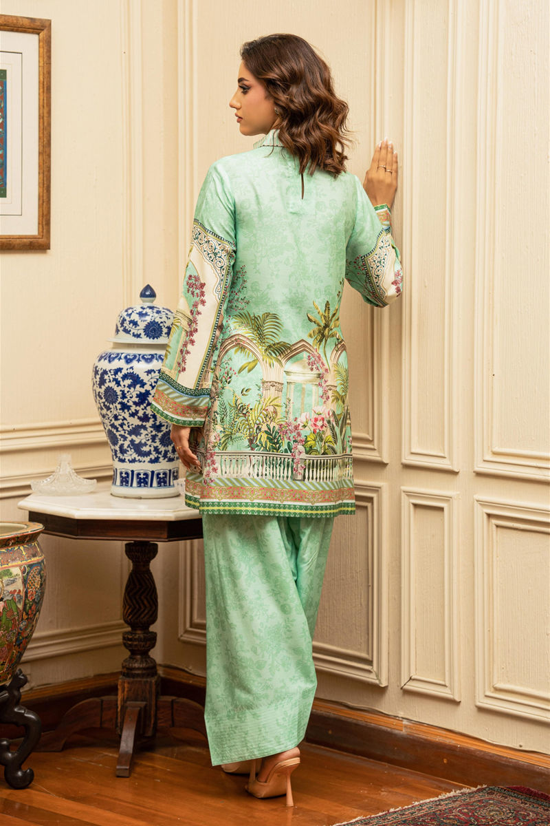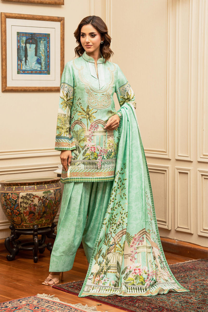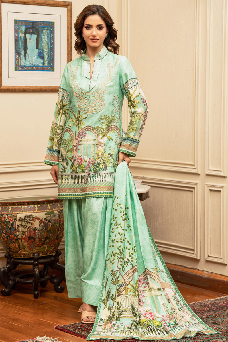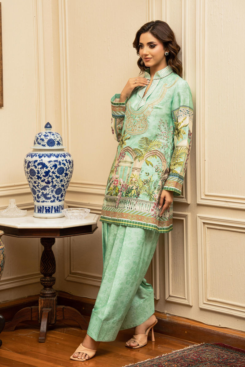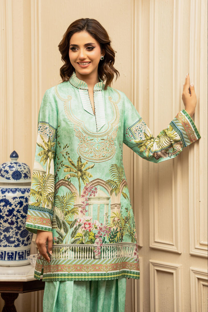This elegant outfit by Shamaeel Ansari features a serene mint green palette with scenic architectural and botanical prints. Paired with a farshi shalwar and a printed dupatta, it exudes grace and refined charm—perfect for a sophisticated daytime look.